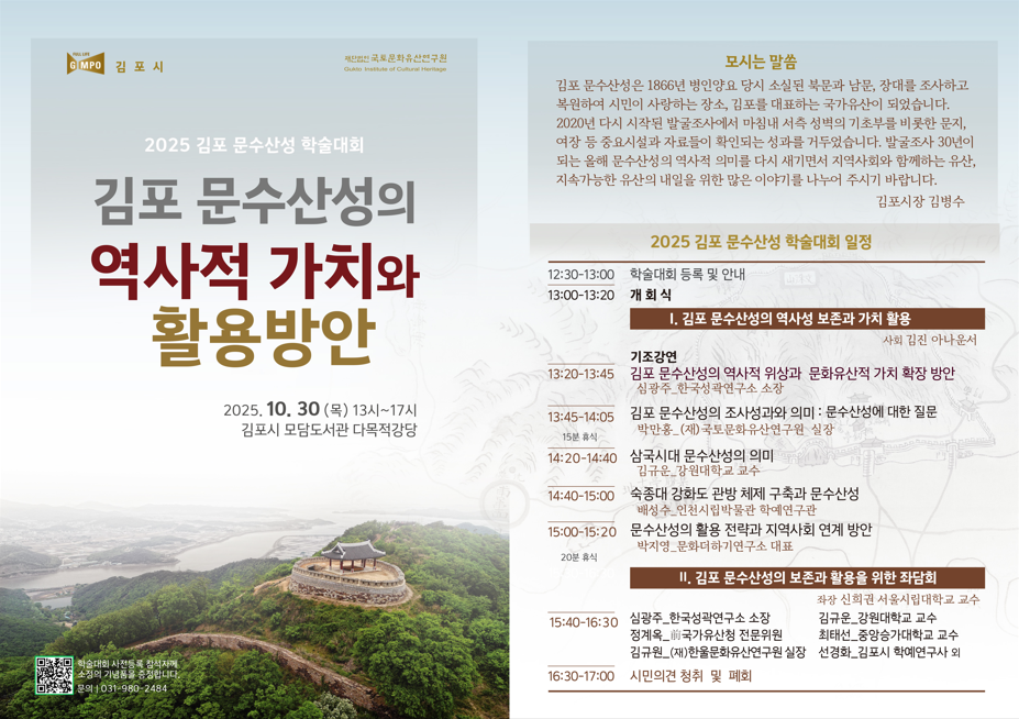 김포 문수산성은 1866년 병인양요 당시 소실된 북문과 남문, 장대를 조사하고 복원하여 시민이 사랑하는 장소, 김포를 대표하는 국가유산이 되었습니다. 2020년 다시 시작된 발굴조사에서 마침내 서측 성벽의 기초부를 비롯한 문지, 여장 등 중요시설과 자료들이 확인되는 성과를 거두었습니다. 발굴조사 30년이 되는 올해 문수산성의 역사적 의미를 다시 새기면서 지역사회와 함께하는 유산, 지속가능한 유산의 내일을 위한 많은 이야기를 나누어 주시기 바랍니다.