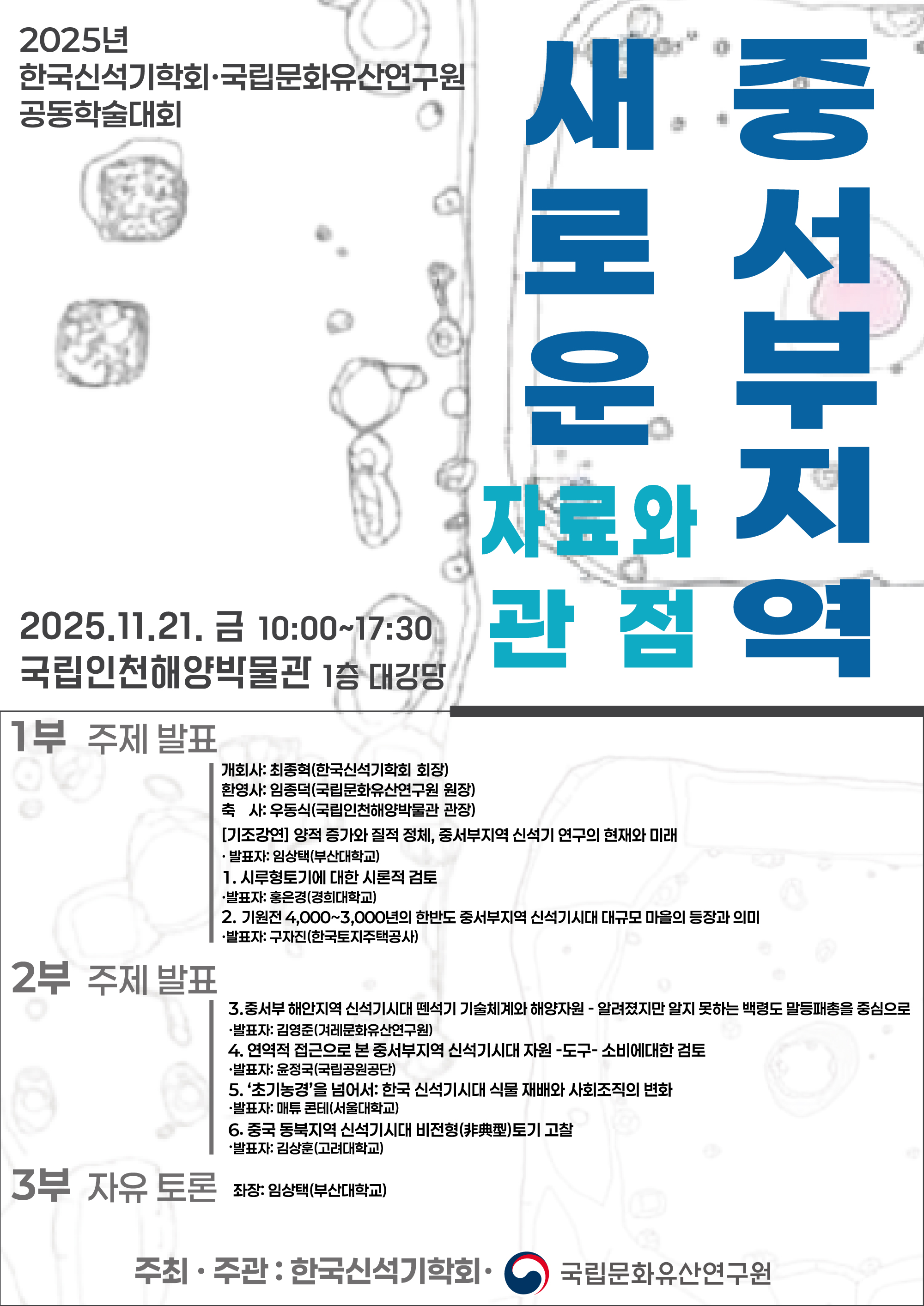한국신석기학회와 국립문화유산연구원이 공동으로 주최하는 <중서부지역 새로운 자료와 관점> 학술대회가 인천국립해양박물관에서 개최됩니다.