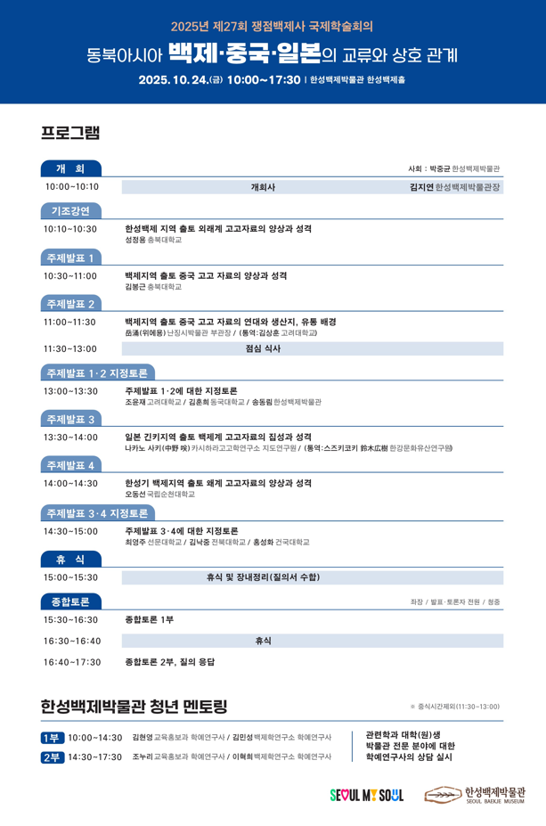 제27회 쟁점백제사 국제학술회의가 10월 24일(금) 서울 한성백제박물관 한성백제홀에서 개최됩니다.