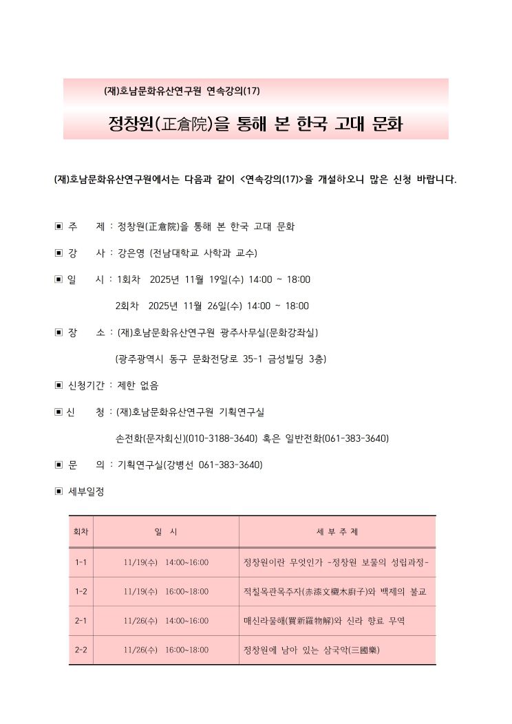 (재)호남문화유산연구원 연속강의(17) 수강 안내