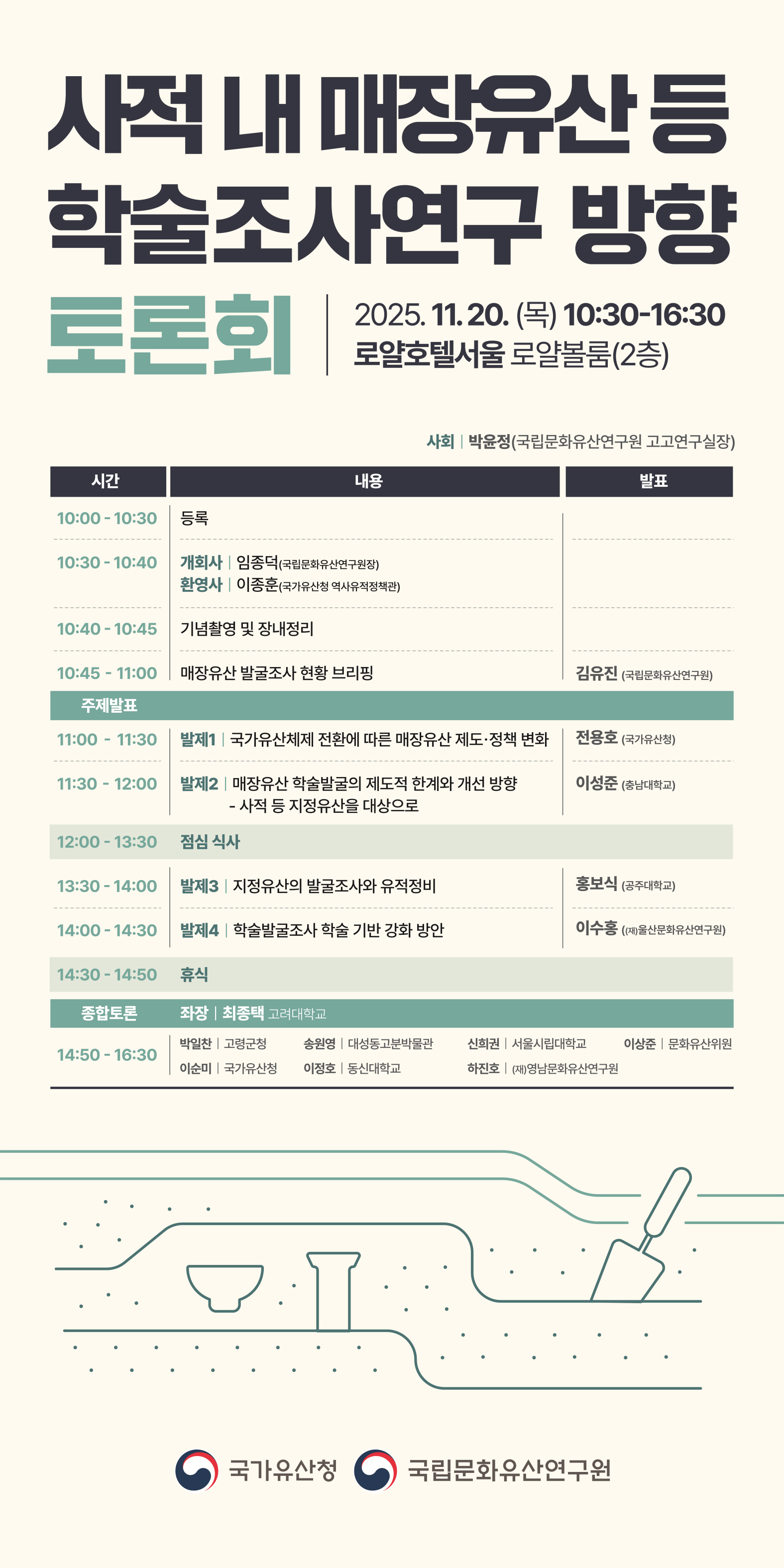 국립문화유산연구원 고고연구실은 국가유산청과 함께 「사적 내 매장유산 등 학술조사연구 방향」토론회를 개최합니다.