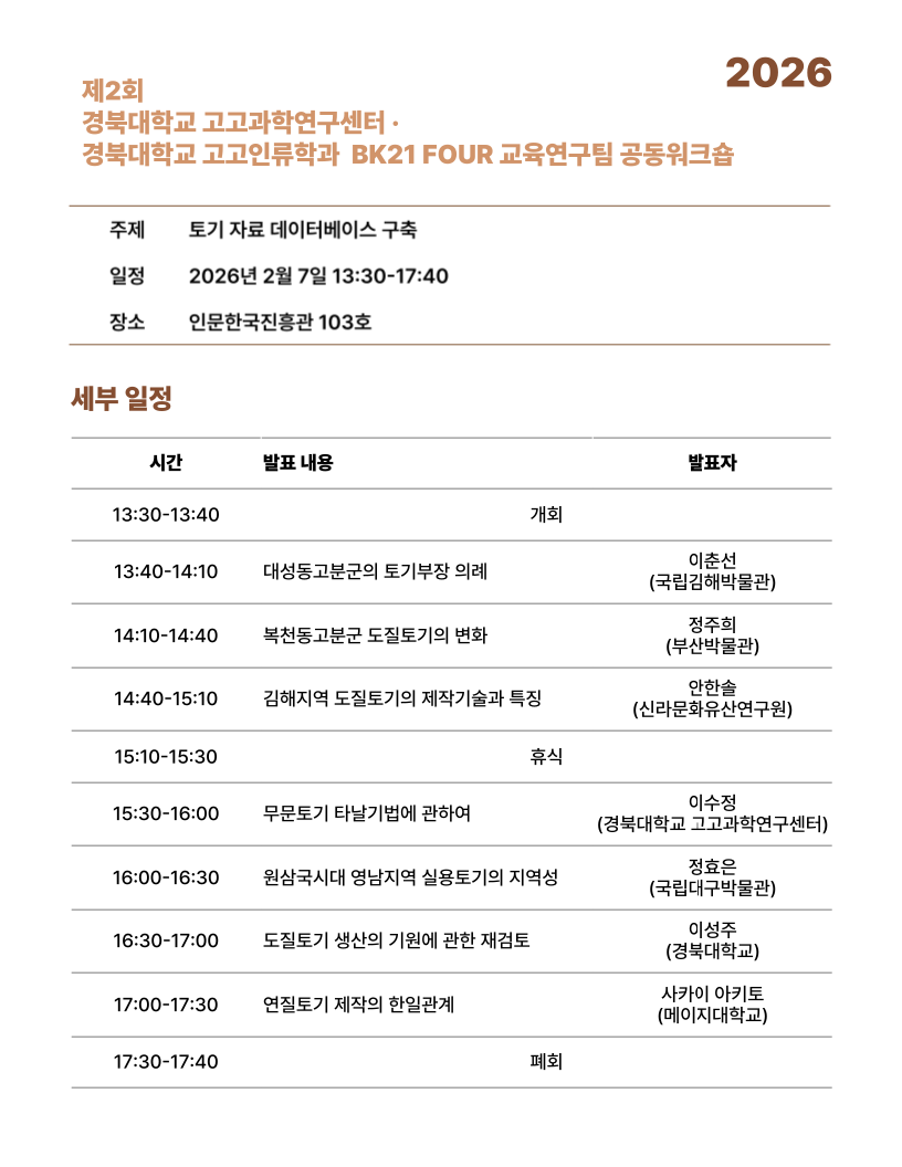 경북대학교 고고과학연구센터와 경북대학교 고고인류학과 BK21 FOUR 교육연구팀에서 공동으로 주최하는 <토기 자료 데이터베이스 구축> 워크숍이 경북대학교 인문한국진흥관 103호에서 개최됩니다.