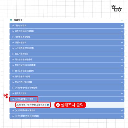 ㅇ KOSIS 홈페이지 접속 → 국내통계 → 기관별 통계 → 협회/조합 → (사)한국문화유산협회 → 고고유산조사연구서비스업실태조사