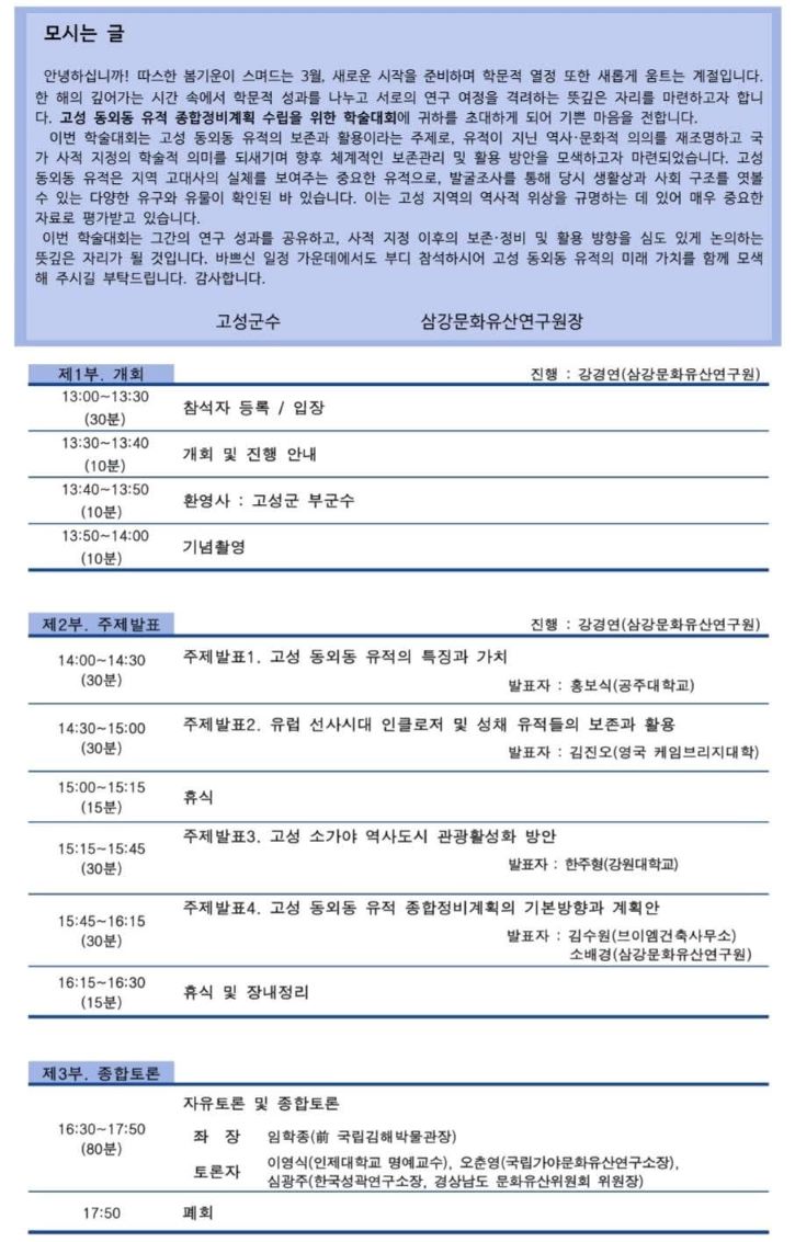 고성군과 삼강문화유산연구원에서는 고성 동의동 유적 종합정비계획 수립을 위한 학술대회를