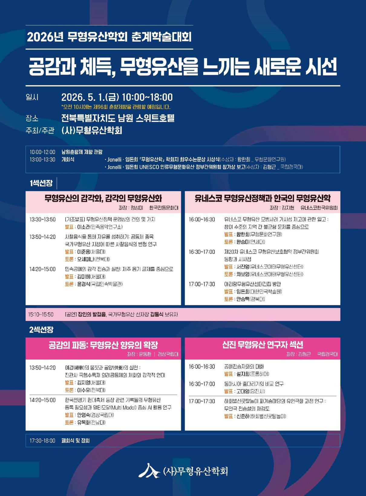 본 학술대회는 남원춘향제 국제학술대회(4월 30일)와 연계되어 더욱 풍성한 학문적 교류의 장이 될 것입니다. 무형유산이 가진 감각의 전승과 실천, 그리고 정책적